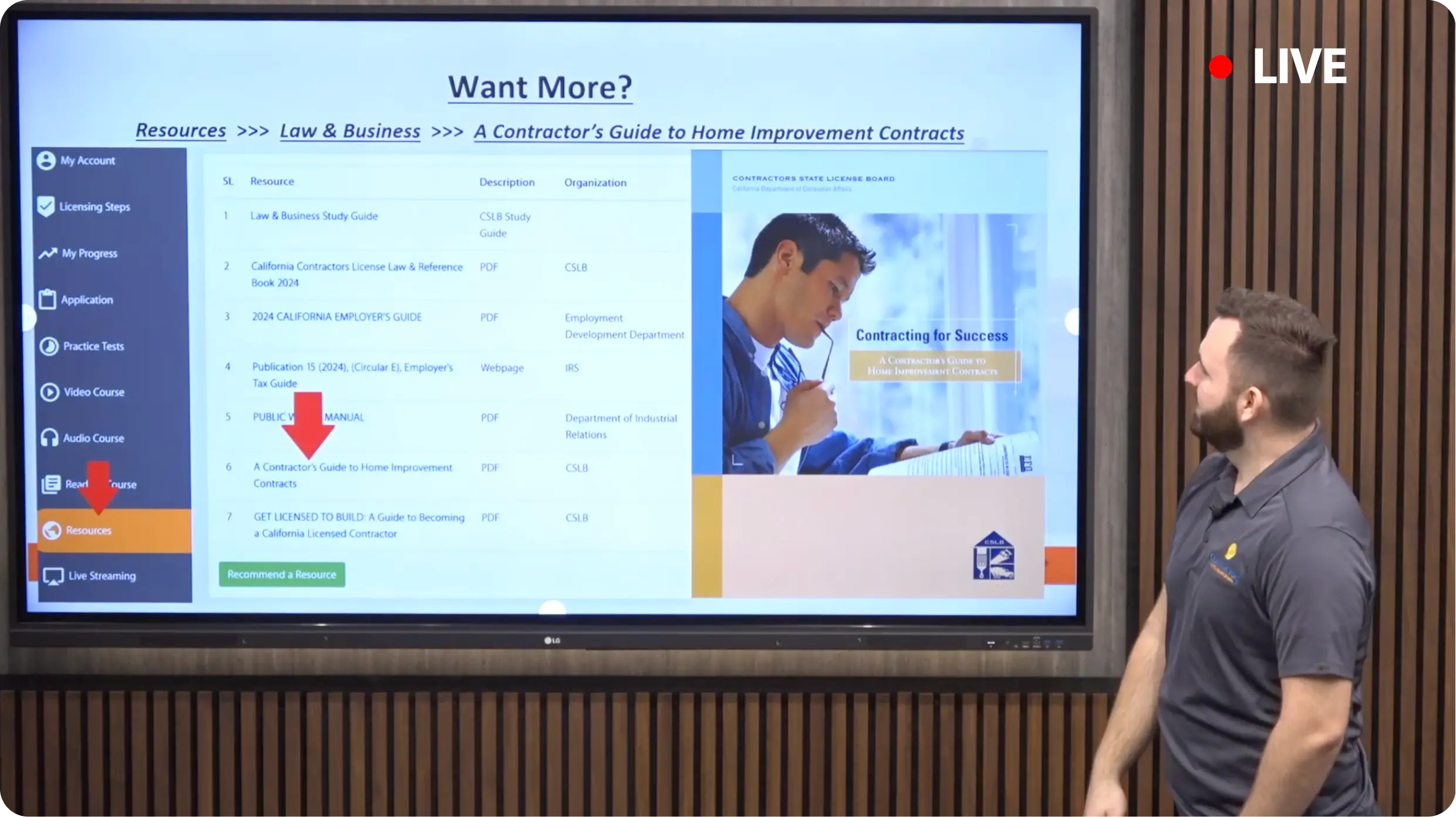 We recommend taking the live class shortly before your scheduled test date so the material is fresh. We’ll also help review and submit your CSLB application as part of the course.